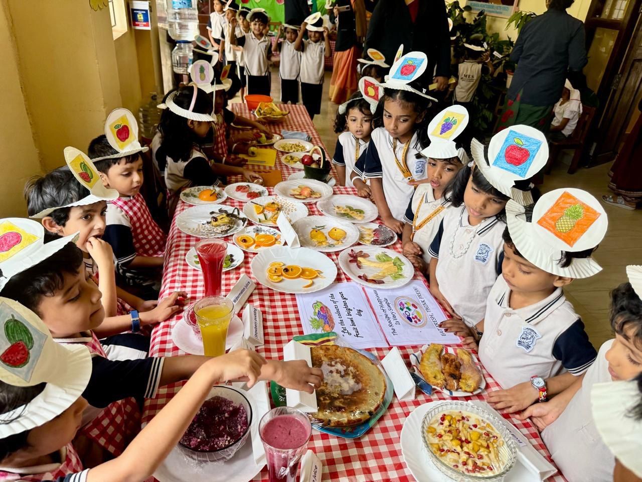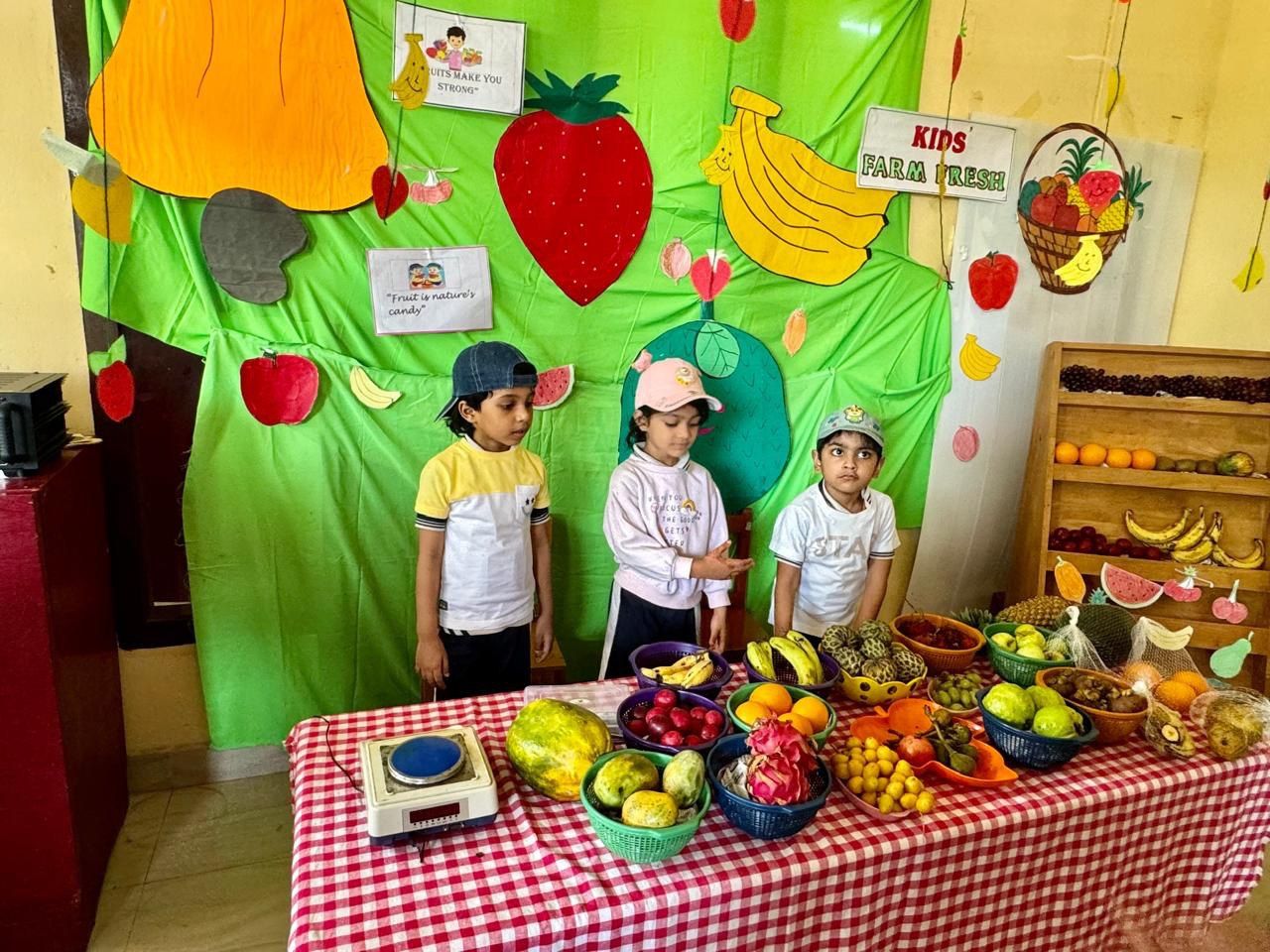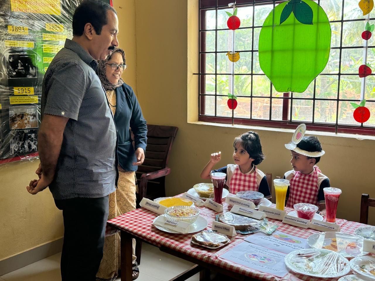 The Fruit Farm visit display in the Montessori block was a major attraction. Additionally, the fruit market, fruit carvings, and various food items made from fruits were exhibited, providing a visual treat.Each student participated in coloring a fruit basket, showcasing their artistic skills.The students along with their teachers made a tasty fruit salad in class. Learning to prepare healthy snacks like fruit salad can be a fun and educational experience for kids, teaching them about different fruits, nutrition, and teamwork.