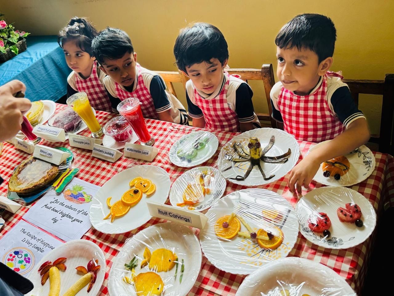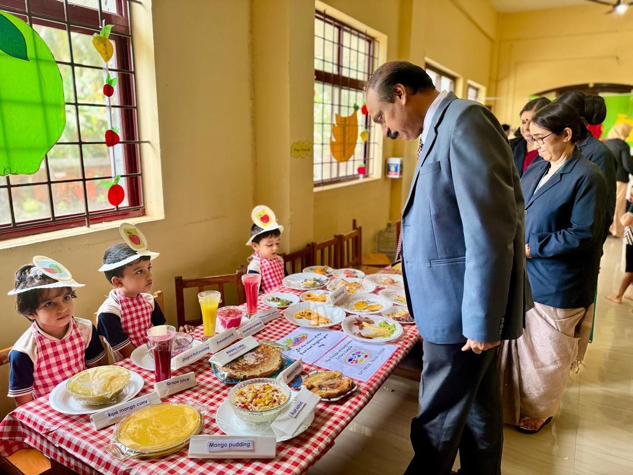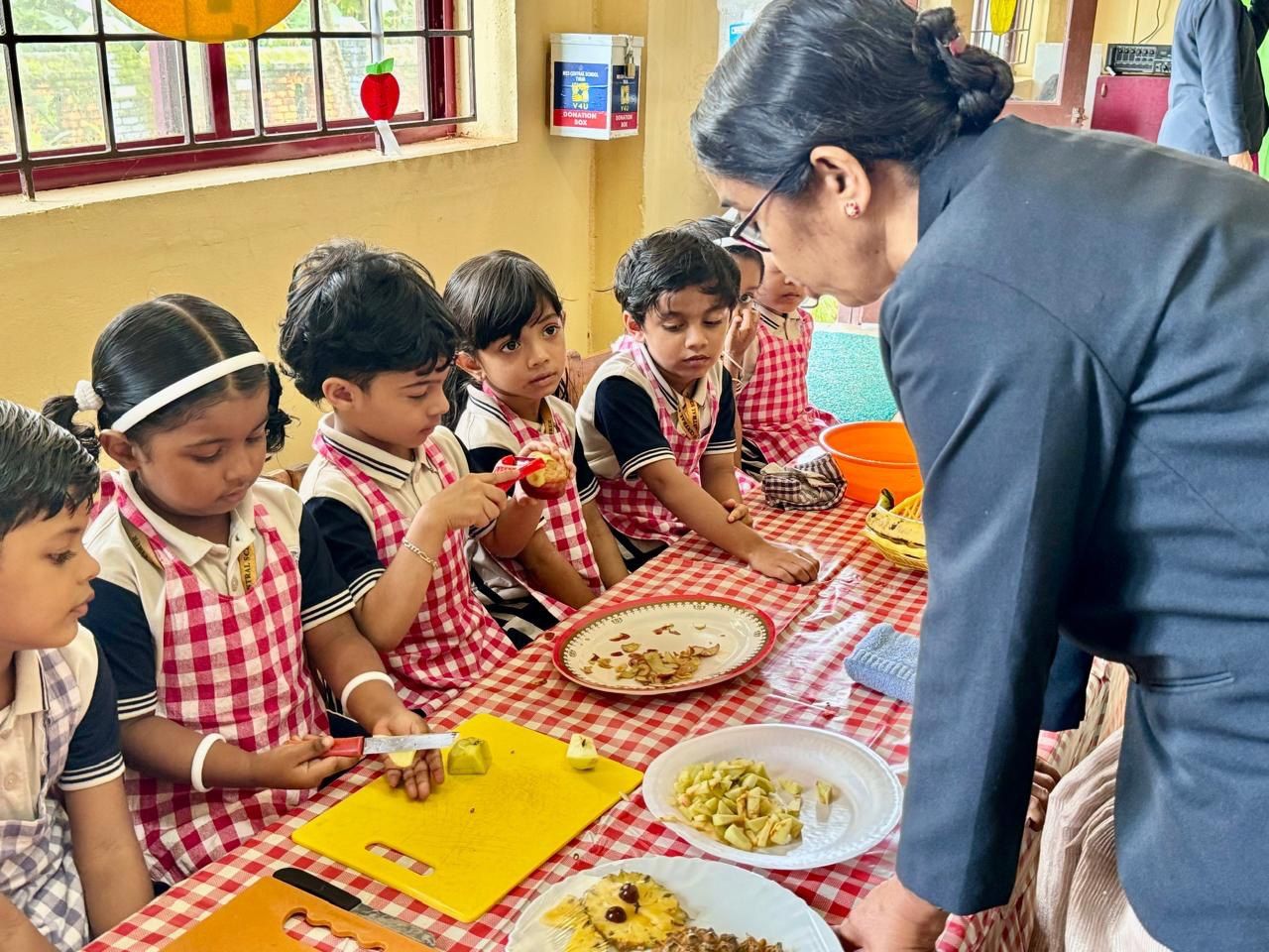 The Fruit Farm visit display in the Montessori block was a major attraction. Additionally, the fruit market, fruit carvings, and various food items made from fruits were exhibited, providing a visual treat.Each student participated in coloring a fruit basket, showcasing their artistic skills.The students along with their teachers made a tasty fruit salad in class. Learning to prepare healthy snacks like fruit salad can be a fun and educational experience for kids, teaching them about different fruits, nutrition, and teamwork.