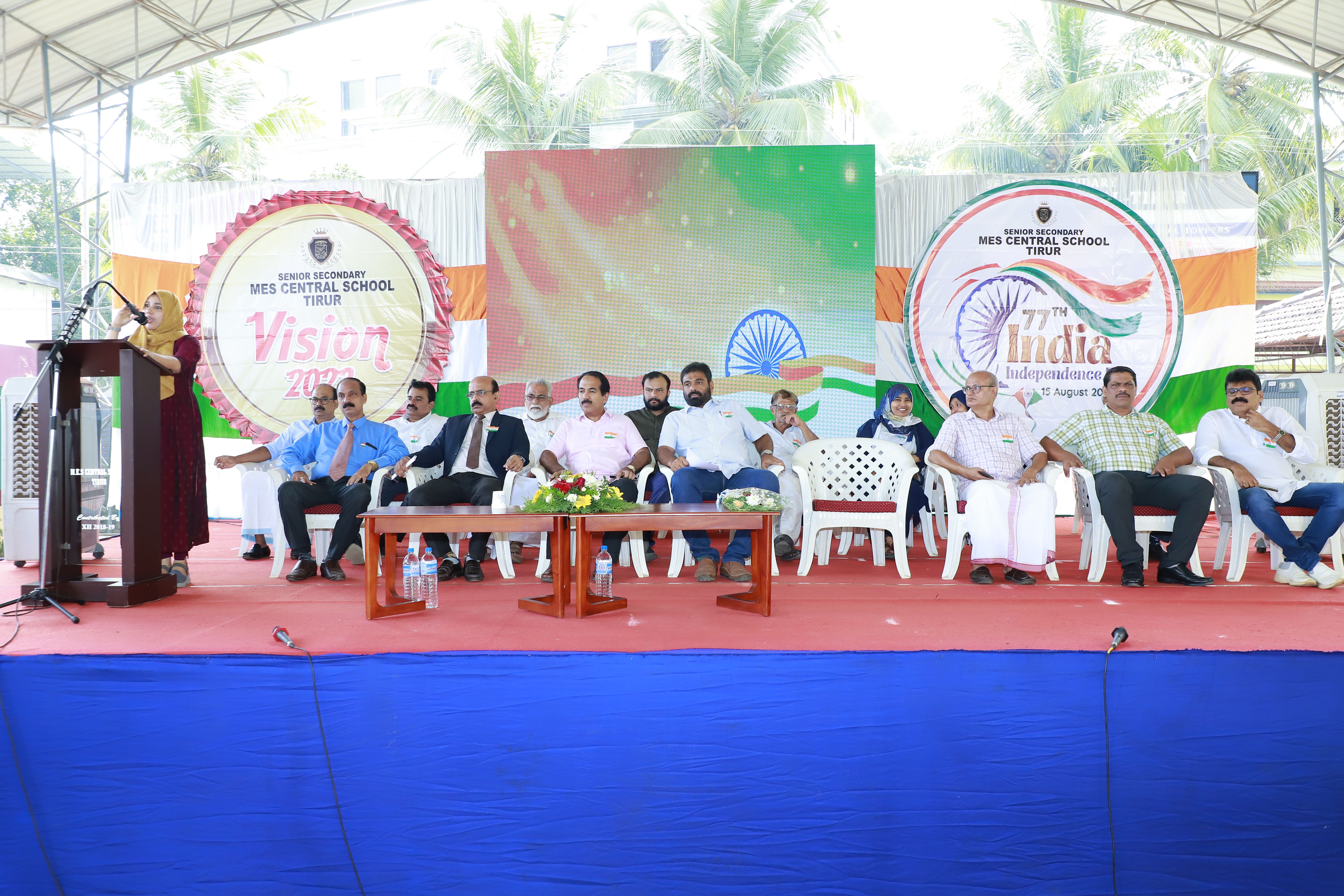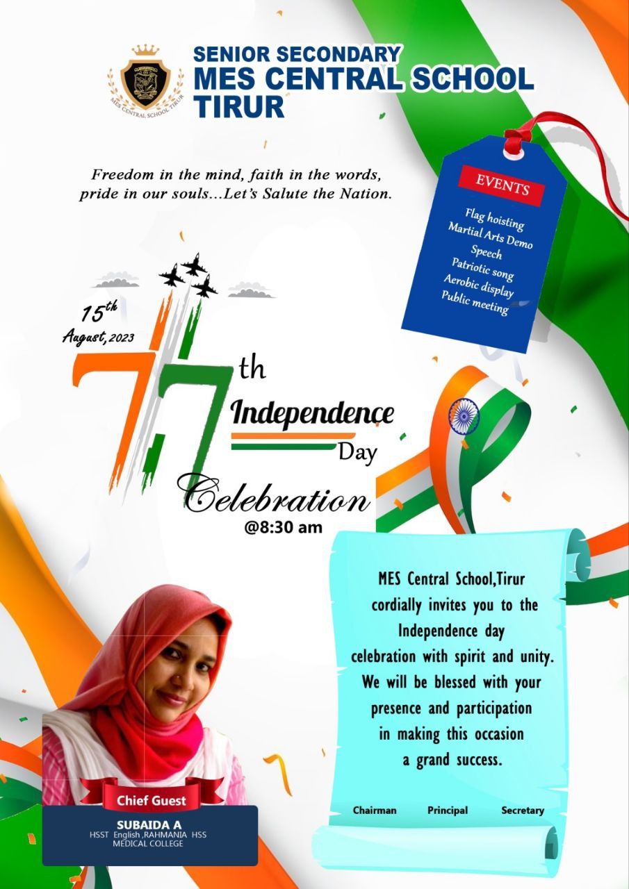 M E S CENTRAL SCHOOL, TIRUR celebrated the 77th Independence Day of our nation with colourful programmes. School Principal Mr. Madhusoodhanan V P hoisted the Flag. Subaida A (HSST ENGLISH, RAHMANIYA HSS, MEDICAL COLLEGE) was the chief guest for the programme. MES TIRUR school treasurer Mr. K. Abdul Jaleel honoured the guest by presenting a momento. The program was blessed with the presence of the school chairman Mr. Anwar Sadath Kalliyath, Secretary Mr. Salam P Lillees, treasurer Mr. Jaleel Kainikkara, Vice chairman Mr. Rasheed P A, Joint secretary Mr. Najmudheen Kallingal. Teachers and students presented various programmes to commemorate patriotism. The function concluded with the vote of thanks by Mr. Benny PT, Vice principal. The highlight of the program was the colourful performances by the intellectually challenged students from Unity Occupational Hub, Tirur