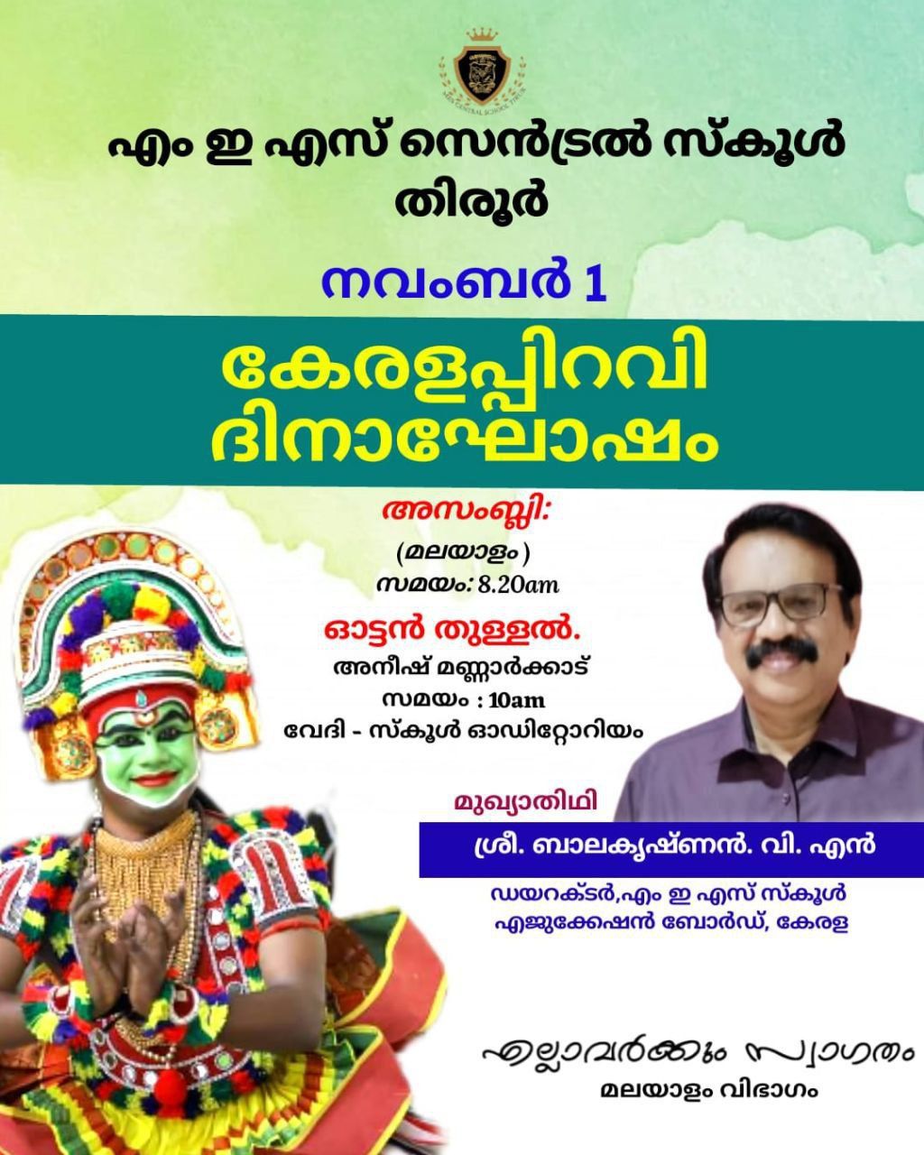 The Primary Montessori section of MES central school,TIRUR conducted a special assembly in connection with the 67th Kerala piravi dinam.Cultural programmes related to kerala piravi was performed by the children of the Montessori section. Music teacher Aneesh, entertained the children by performing Shithankan thullal.The school Management members, Education Board director, School Principal, Vice Principal and HM Pre-Primary honoured the day with their presence.