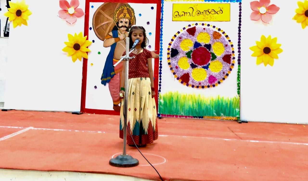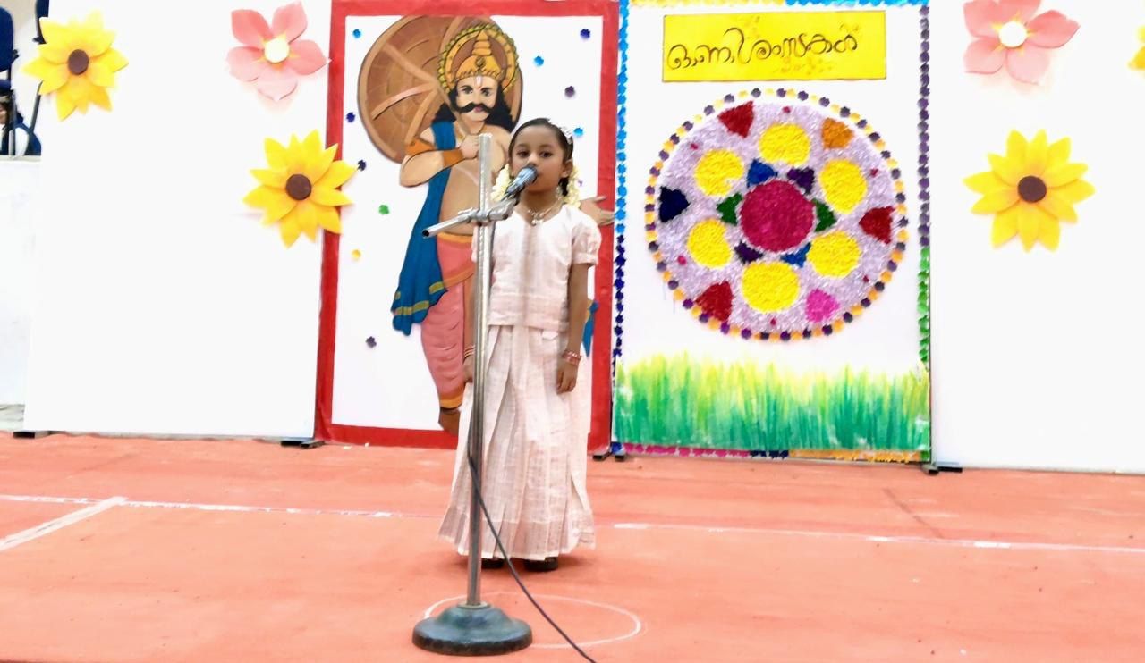 The program began with a warm welcome speech by Mariyam Zakariya, a student from Dahlia, who set the tone for the festive day. This was followed by an impressive Onam speech in English delivered by Henza Fathima of Environment Dahlia, who spoke about the significance and customs of Onam and Ayomi from environment Clavia then gave a heartfelt Malayalam speech, further enriching the audience’s understanding of the festival.