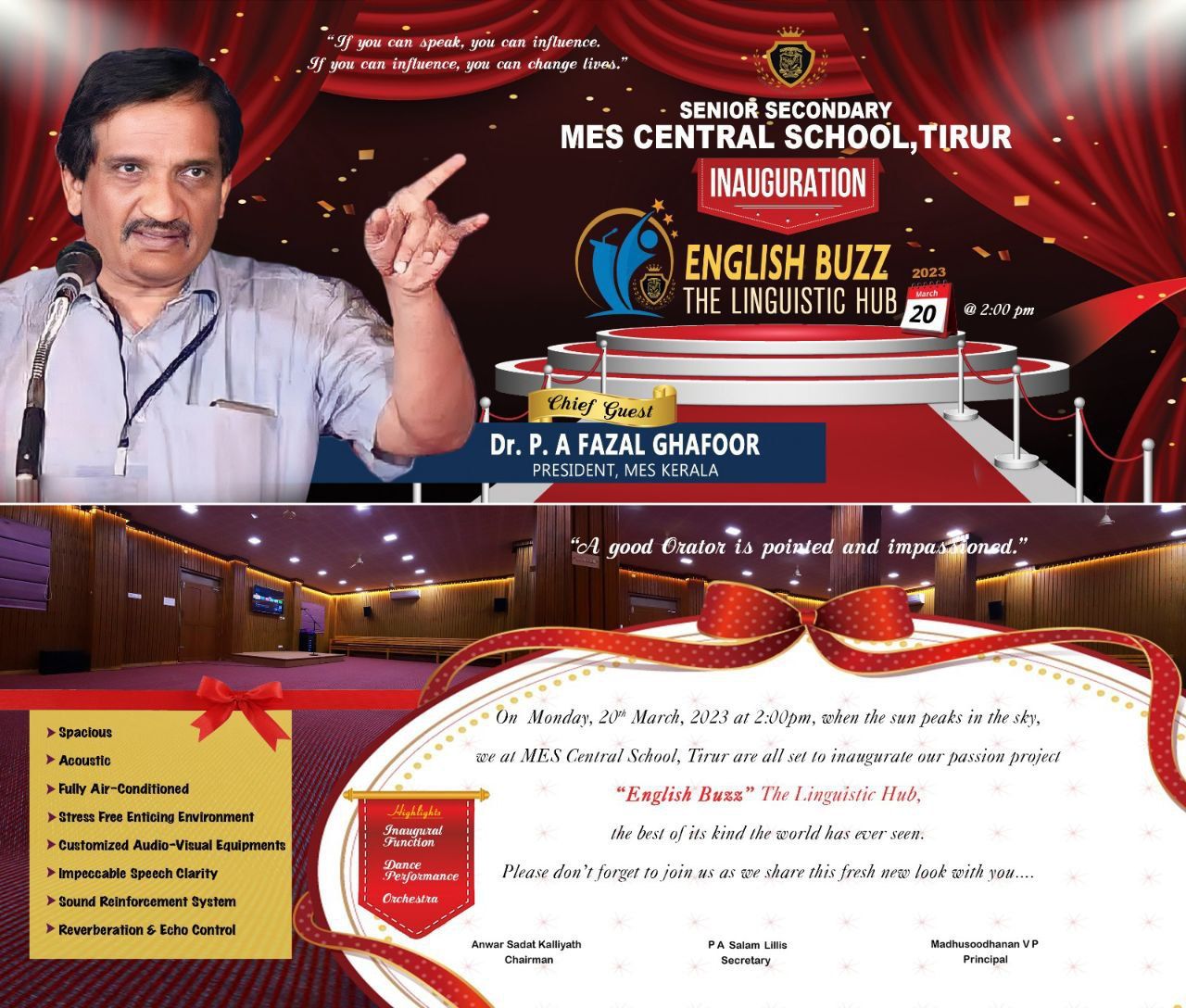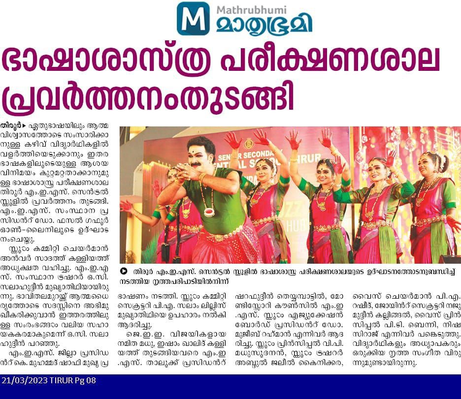The function was presided by Mr. Anwar Sadat Kalliyath, Chairman, MES Central School, Tirur. English Buzz was inaugurated by Dr. P A FAZAL GAFOOR, PRESIDENT. MES KERALA through online. MES State treasurer O. C Salahudheen was the Chief Guest of the program. The School Secretary Mr. Salam P Lillis honoured the guest by presenting a memento. Mr. Sharafudheen Theyyambattil MES Tirur Taluk President, and Dr. Mujeeb Rahman, President of Montissori Counsil, of MES School Education Board presented mementos to the JEE toppers Namitha Madhu and Hisham khalid respectively.