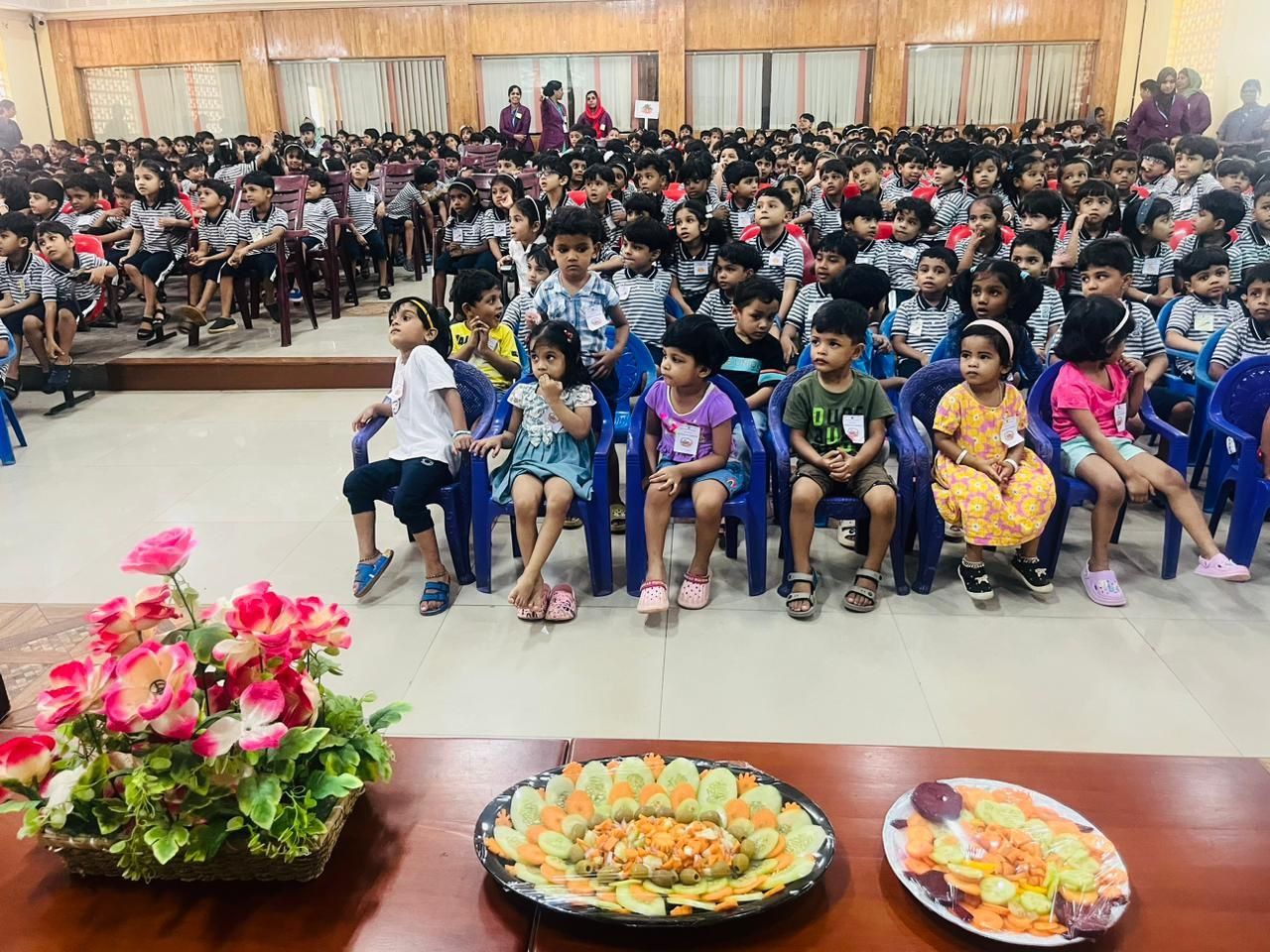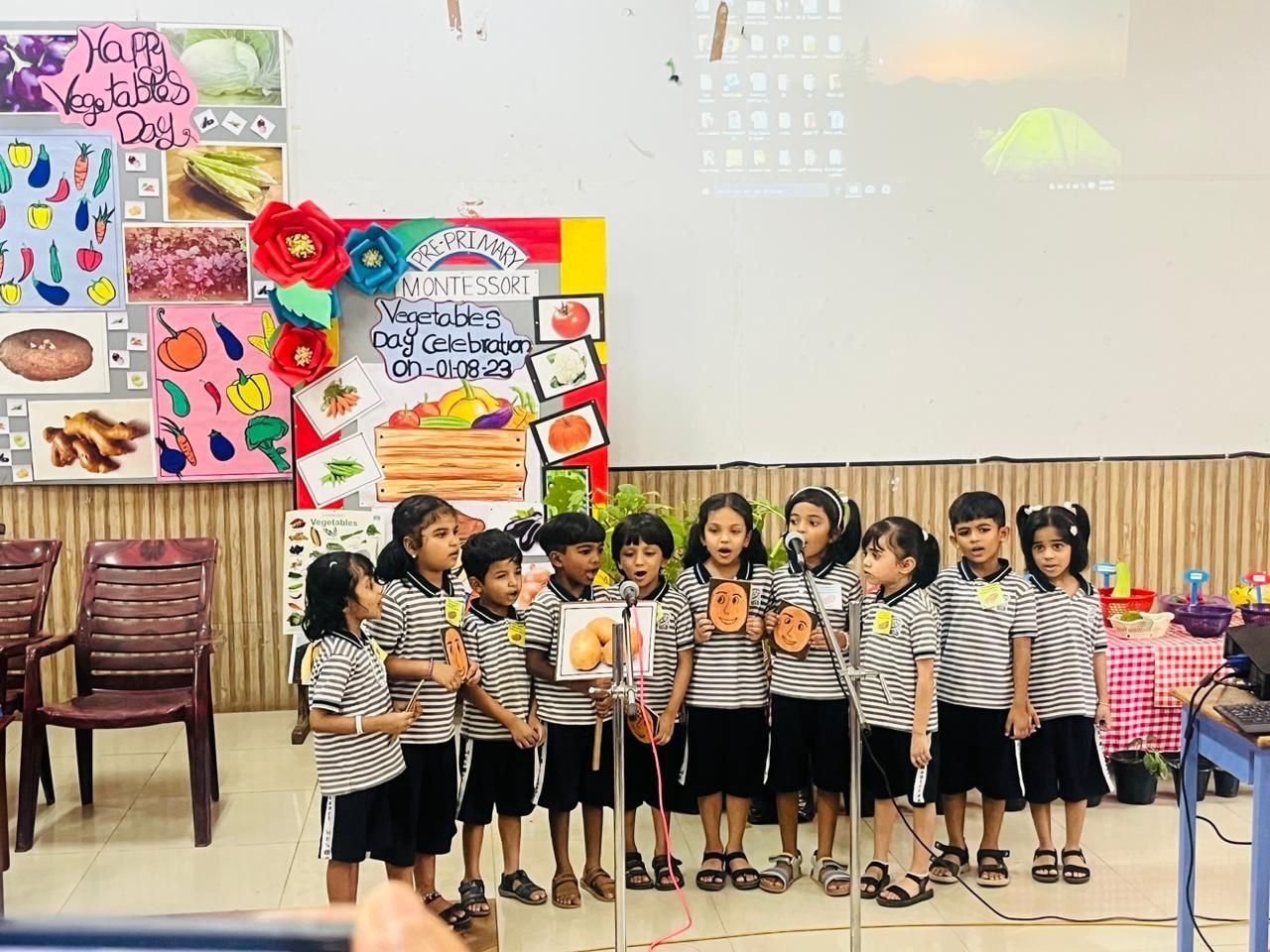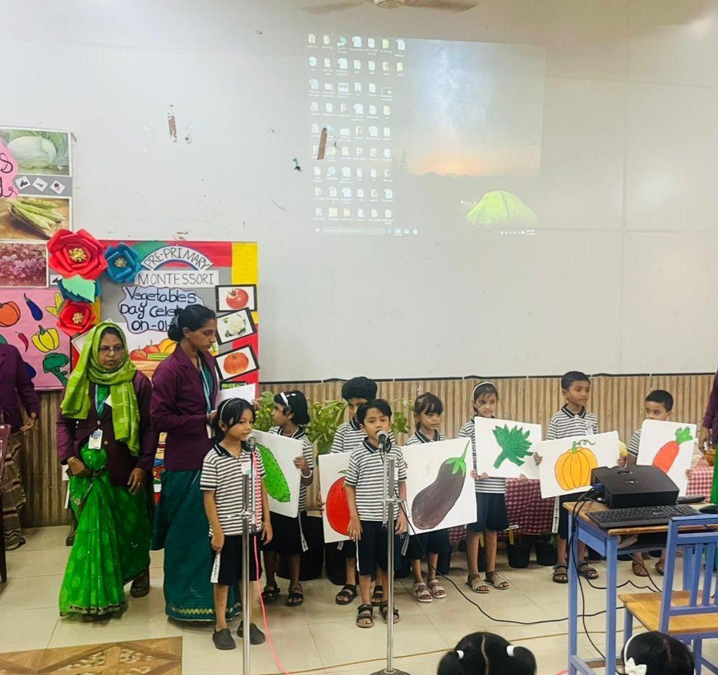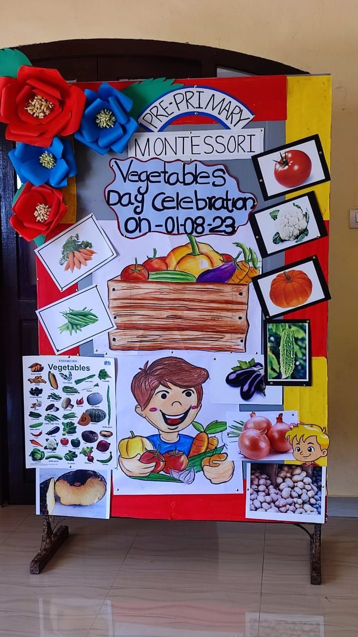Vegetable day celebration was held on 1st August 2023 in the Pre-Primary section of MES Central school, Tirur. The Assembly was enlightened with informative and entertaining programmes by students and teachers. Children were given opportunity to cut the vegetables and make a salad. They observed different vegetables and their plants displayed in the courtyard of Montessori block. Children did vegetable printing on the Vegetable picture in their Activity sheets. They were also given awareness about the importance of including vegetables in our diet.