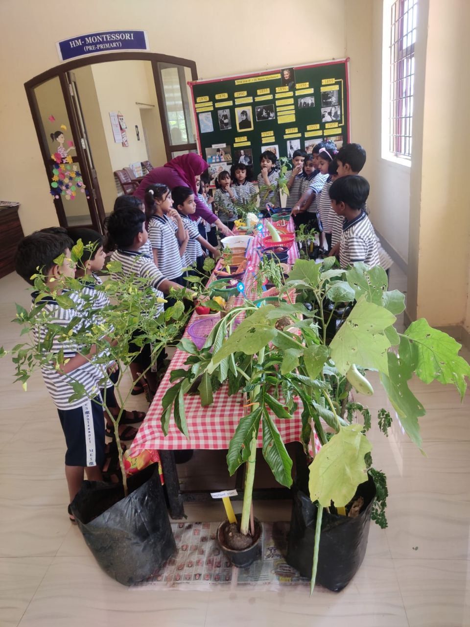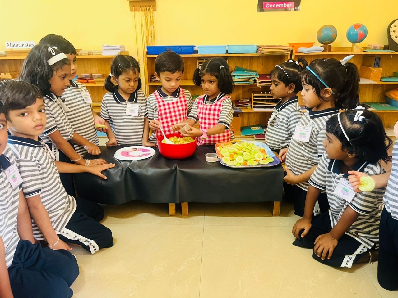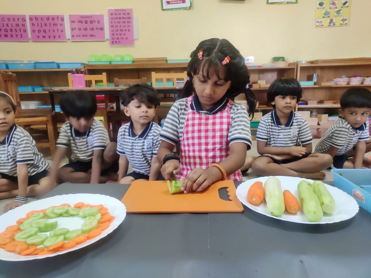 Vegetable day celebration was held on 1st August 2023 in the Pre-Primary section of MES Central school, Tirur. The Assembly was enlightened with informative and entertaining programmes by students and teachers. Children were given opportunity to cut the vegetables and make a salad. They observed different vegetables and their plants displayed in the courtyard of Montessori block. Children did vegetable printing on the Vegetable picture in their Activity sheets. They were also given awareness about the importance of including vegetables in our diet.