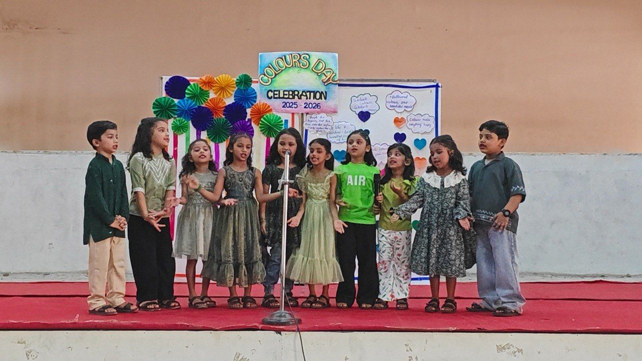 The Colours Day celebration of the Pre-Primary Montessori was conducted on 25th March 2026 with great enthusiasm. A special assembly was organized by environments Kunzea and Laelia. The programme began with anchoring by Ayaan Hamza and Zohan Ali, followed by a prayer and a prayer song by the seniors of both classes.The pledge and the thought for the day was also presented. Emin Aibak welcomed the gathering, and Faiqa Fatim delivered a speech on Colours Day. The event included a Malayalam rhyme by Kunzea seniors and an English rhyme by Laelia seniors. A vibrant dance performance by the senior girls added colour to the celebration.A quiz was also conducted related to colours. The Headmistress, Jyothi Gopal, delivered a special speech. A video presentation on colours was presented by Smitha Biju, and Assistant Headmistress Hemalatha ma’am addressed the audience. All environments actively participated by presenting songs and speeches based on their allotted colours. The programme concluded with a vote of thanks by Mehwish Fathima. After the assembly, children visited various environments to enjoy colourful displays. Overall, it was a joyful and colourful day for everyone.
